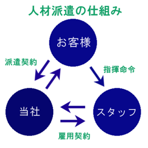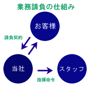 スタッフの雇用・勤怠管理・賃金支払い・各種保険の加入は当社が行い、業務の指揮命令のみをお客様にして頂きます。
