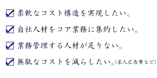 スタッフの雇用・勤怠管理・賃金支払い・各種保険の加入は当社が行い、業務の指揮命令のみをお客様にして頂きます。